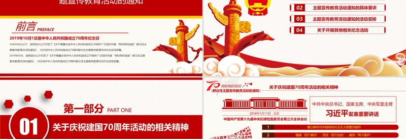 <p>慶慶祝祝中華人民共和國成立我和我的祖國關(guān)于隆重慶祝中華人民共和國成立70周年廣泛組織開展“我和我的祖國”群眾性主題宣傳教育活動(dòng)的通知70年披荊斬棘 70年昂首奮進(jìn)周年</p><br><p>前言PREFACE2019年10月1日是中華人民共和國成立70周年紀(jì)念日中共中央辦公廳、國務(wù)院辦公廳印發(fā)了《關(guān)于隆重慶祝中華人民共和國成立70周年廣泛組織開展“我和我的祖國”群眾性主題宣傳教育活動(dòng)的通知》,對(duì)慶祝中華人民共和國成立70周年群眾性主題宣傳教育活動(dòng)作出安排部署。2019年05月,國務(wù)院辦公廳印發(fā)了《關(guān)于隆重慶祝中華人民共和國成立70周年廣泛組織開展“我和我的祖國”群眾性主題宣傳教育活動(dòng)的通知》,對(duì)慶祝中華人民共和國成立70周年群眾性主題宣傳教育活動(dòng)作出安排部署。關(guān)于隆重慶祝中華人民共和國成立70周年廣泛組織開展“我和我的祖國”群眾性主題宣傳教育活動(dòng)的通知</p><br><p>目 錄CONTENTS</p><br><p>關(guān)于慶祝建國70周年活動(dòng)的相關(guān)精神第一部分 PART ONE</p><br><p>關(guān)于慶祝建國70周年活動(dòng)的相關(guān)精神2019年1月11日 北京中國共產(chǎn)黨第十九屆中央紀(jì)律檢查委員會(huì)第三次全體會(huì)議中共中央總書記、國家主席、中央軍委主席發(fā)表重要講話以優(yōu)異成績慶祝中華人民共和國成立70周年</p><br><p>關(guān)于慶祝建國70周年活動(dòng)的相關(guān)精神黨的十九大以來,我們貫徹落實(shí)新時(shí)代黨的建設(shè)總要求堅(jiān)持把黨的政治建設(shè)擺在首位,深化運(yùn)用監(jiān)督執(zhí)紀(jì)“四種形態(tài)”,奪取反腐敗斗爭(zhēng)壓倒性勝利,著力懲治群眾身邊的腐敗問題,完善黨和國家監(jiān)督體系,取得了新的重大成果,為實(shí)現(xiàn)黨和國家事業(yè)新發(fā)展提供了堅(jiān)強(qiáng)保障。一年多來,經(jīng)過全黨共同努力,黨的集中統(tǒng)一領(lǐng)導(dǎo)更加堅(jiān)強(qiáng)有力,黨的建設(shè)新的偉大工程全方位加強(qiáng),全面從嚴(yán)治黨實(shí)效性不斷提高,黨內(nèi)政治生態(tài)進(jìn)一步改善,黨在新時(shí)代新征程中煥發(fā)出更加強(qiáng)大的生機(jī)活力。強(qiáng)調(diào)在黨中央堅(jiān)強(qiáng)領(lǐng)導(dǎo)下,各級(jí)紀(jì)檢監(jiān)察機(jī)關(guān)堅(jiān)持黨的領(lǐng)導(dǎo)、從嚴(yán)管黨治黨,探索積累了寶貴經(jīng)驗(yàn)維護(hù)黨中央權(quán)威和集中統(tǒng)一領(lǐng)導(dǎo),確保全黨步調(diào)一致、行動(dòng)統(tǒng)一治國必先治黨、治黨務(wù)必從嚴(yán),確保黨成為中國特色社會(huì)主義事業(yè)的中流砥柱以人民為中心,確保立黨為公、執(zhí)政為民改革創(chuàng)新、艱苦奮斗作風(fēng),確保黨始終走在時(shí)代前列</p><br><p>關(guān)于慶祝建國70周年活動(dòng)的相關(guān)精神黨的十九大以來,我們貫徹落實(shí)新時(shí)代黨的建設(shè)總要求堅(jiān)持把黨的政治建設(shè)擺在首位,深化運(yùn)用監(jiān)督執(zhí)紀(jì)“四種形態(tài)”,奪取反腐敗斗爭(zhēng)壓倒性勝利,著力懲治群眾身邊的腐敗問題,完善黨和國家監(jiān)督體系,取得了新的重大成果,為實(shí)現(xiàn)黨和國家事業(yè)新發(fā)展提供了堅(jiān)強(qiáng)保障。一年多來,經(jīng)過全黨共同努力,黨的集中統(tǒng)一領(lǐng)導(dǎo)更加堅(jiān)強(qiáng)有力,黨的建設(shè)新的偉大工程全方位加強(qiáng),全面從嚴(yán)治黨實(shí)效性不斷提高,黨內(nèi)政治生態(tài)進(jìn)一步改善,黨在新時(shí)代新征程中煥發(fā)出更加強(qiáng)大的生機(jī)活力。強(qiáng)調(diào)在黨中央堅(jiān)強(qiáng)領(lǐng)導(dǎo)下,各級(jí)紀(jì)檢監(jiān)察機(jī)關(guān)堅(jiān)持黨的領(lǐng)導(dǎo)、從嚴(yán)管黨治黨,探索積累了寶貴經(jīng)驗(yàn)同消極腐敗現(xiàn)象作斗爭(zhēng),確保黨永葆清正廉潔的政治本色自我凈化自我完善自我革新自我提高</p><br><p>關(guān)于慶祝建國70周年活動(dòng)的相關(guān)精神強(qiáng)調(diào)2019年是是一是深入貫徹落實(shí)黨的十九大精神,不斷強(qiáng)化思想武裝。堅(jiān)持用新時(shí)代中國特色社會(huì)主義思想武裝頭腦,經(jīng)常對(duì)表對(duì)標(biāo),及時(shí)校準(zhǔn)偏差。各級(jí)黨組織要旗幟鮮明堅(jiān)持和加強(qiáng)黨的全面領(lǐng)導(dǎo),堅(jiān)持黨中央重大決策部署到哪里,監(jiān)督檢查就跟進(jìn)到哪里,確保黨中央令行禁止。就此提出6項(xiàng)任務(wù)二是加強(qiáng)黨的政治建設(shè),保證全黨集中統(tǒng)一、令行禁止。要貫徹落實(shí)新形勢(shì)下黨內(nèi)政治生活若干準(zhǔn)則,發(fā)展積極健康的黨內(nèi)政治文化。要把力戒形式主義、官僚主義作為重要任務(wù)。各地區(qū)各部門黨委(黨組)要履行主體責(zé)任,緊盯形式主義、官僚主義新動(dòng)向新表現(xiàn),拿出有效管用的整治措施。三是弘揚(yáng)優(yōu)良作風(fēng),同心協(xié)力實(shí)現(xiàn)小康。要把剎住“四風(fēng)”作為鞏固黨心民心的重要途徑,對(duì)享樂主義、奢靡之風(fēng)等歪風(fēng)陋習(xí)要露頭就打,對(duì)“四風(fēng)”隱形變異新動(dòng)向要時(shí)刻防范。</p><br><p>關(guān)于慶祝建國70周年活動(dòng)的相關(guān)精神強(qiáng)調(diào)2019年是是四是堅(jiā