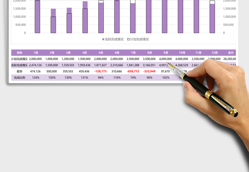 銷售任務(wù)完成情況條形柱狀圖excel表格模板