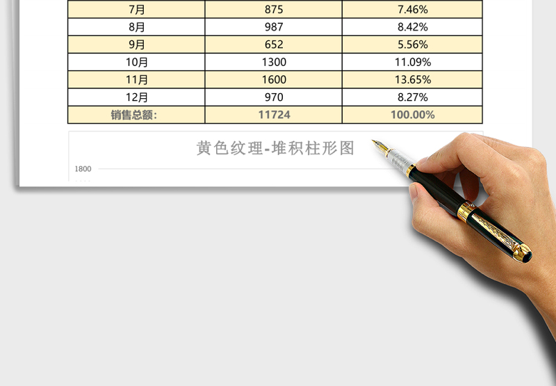黃色銷(xiāo)售表格堆積柱形圓環(huán)圖Excel模板