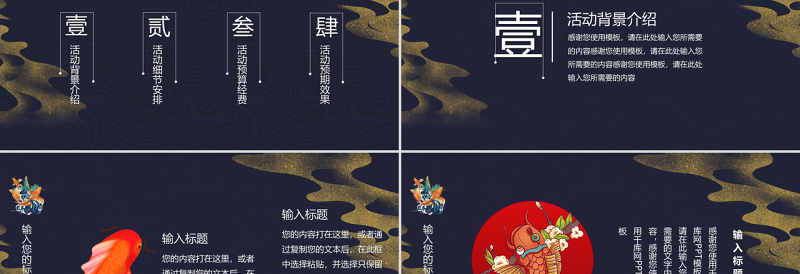 深藍(lán),國(guó)潮,中國(guó)風(fēng),中式,傳統(tǒng),好運(yùn),傳統(tǒng),手繪,插畫,錦鯉,活動(dòng)策劃,活動(dòng)計(jì)劃,商業(yè)計(jì)劃書,活動(dòng)宣傳,匯報(bào),PPT,模板 Array