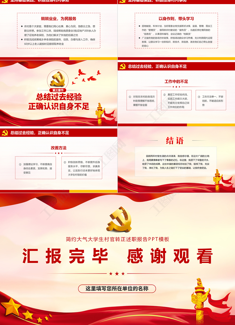 工圖網(wǎng)提供2021大學(xué)生村官轉(zhuǎn)正述職報(bào)告PPT紅色黨政風(fēng)農(nóng)村基層村干部思想?yún)R報(bào)工作總結(jié)黨課模板供會(huì)員免費(fèi)下載。更多精彩黨課PPT素材,盡在工圖網(wǎng)。