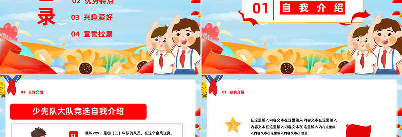 01 自我介紹0102我叫xxx,是四(二)中隊的隊員,在這個金風(fēng)送爽、碩果累累的季節(jié)里,我充滿了感激之情,感謝我們小學(xué),把我從一個一無所知的孩子培養(yǎng)成了一名品學(xué)兼優(yōu)的、知書達理的好學(xué)生,也正是因為有了這份收獲,才使我充滿自信地站在這里,參加少先隊大隊委員競選活動。 少先隊大隊競選自我介紹