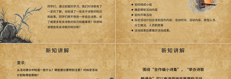 圍繞“合作編小詩(shī)集”,“舉辦詩(shī)歌朗誦會(huì)”可以有選擇地開(kāi)展哪些活動(dòng),如何開(kāi)展活動(dòng)。新知講解