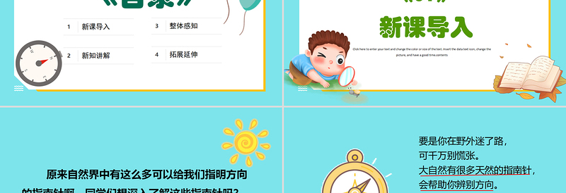 原來自然界中有這么多可以給我們指明方向的指南針啊,同學(xué)們想深入了解這些指南針嗎?今天就讓我們?nèi)フn文去瞧一瞧吧!