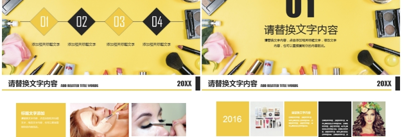 黃色創(chuàng)意美容化妝化妝工具時尚美妝PPT Array