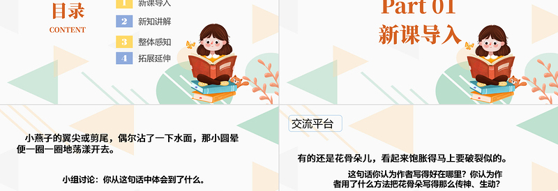 小組討論:你從這句話中體會到了什么。 小燕子的翼尖或剪尾,偶爾沾了一下水面,那小圓暈便一圈一圈地蕩漾開去。讀這句話我體會到小燕子飛行的輕盈。讀這句話,我感到語言很美,“小圓圈”“一圈一圈地蕩漾開去”感覺很有畫面感,仿佛看到了那樣的場景。