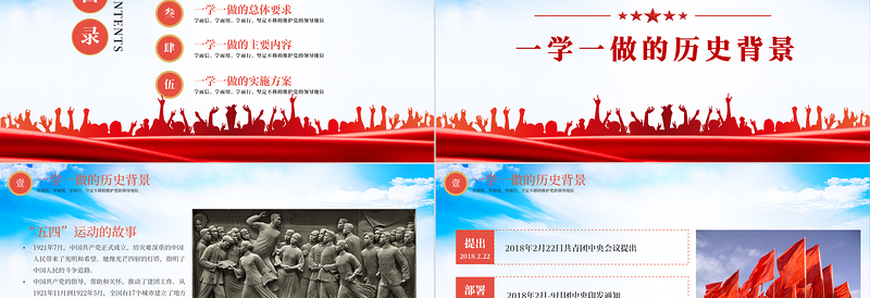 壹一學一做的歷史背景學而信,學而用,學而行,堅定不移的維護黨的領(lǐng)導地位學習黨中央書記講話團中央決定,2018年在全體團員中開展學“黨中央書記講話,做合格共青團員”學習教育。簡稱【一學一做】各級團組織和廣大團干部、團員要更加緊密地團結(jié)在以同志為核心的黨中央周圍,牢固樹立“四個意識”,扎實開展“一學一做”教育實踐,全面推進改革攻堅、從嚴治團各項工作,擼起袖子加油干,以扎實業(yè)績迎接黨的十九大勝利召開。做合格共青團員學做