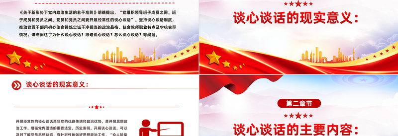 《關(guān)于新形勢(shì)下黨內(nèi)政治生活的若干準(zhǔn)則》明確提出,“黨組織領(lǐng)導(dǎo)班子成員之間、班子成員和黨員之間、黨員和黨員之間要開展經(jīng)常性的談心談話”。堅(jiān)持談心談話制度,推動(dòng)黨員干部用初心使命錘煉忠誠(chéng)干凈擔(dān)當(dāng)?shù)恼纹犯瘛=Y(jié)合教師職業(yè)特點(diǎn)及學(xué)校實(shí)際情況,詳細(xì)闡述了為什么談心談話?跟誰(shuí)談心談話?怎么談心談話?等問題。