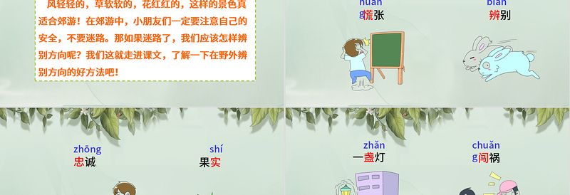 風輕輕的,草軟軟的,花紅紅的,這樣的景色真適合郊游!在郊游中,小朋友們一定要注意自己的安全,不要迷路。那如果迷路了,我們應該怎樣辨別方向呢?我們這就走進課文,了解一下在野外辨別方向的好方法吧!課文導入