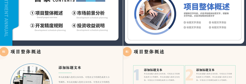 CONTENTS目錄項目整體概述 開發(fā)精度規(guī)則市場前景分析 投資收益說明Overall project overviewDEPARTMENT ANNUALLOGODevelopment schedule planningDevelopment schedule planningDevelopment schedule planning
