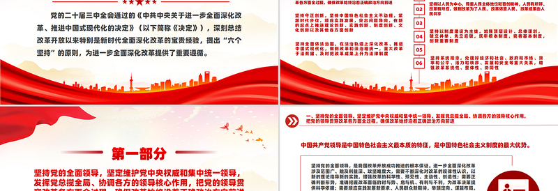 第一部分堅(jiān)持黨的全面領(lǐng)導(dǎo),堅(jiān)定維護(hù)黨中央權(quán)威和集中統(tǒng)一領(lǐng)導(dǎo),發(fā)揮黨總攬全局、協(xié)調(diào)各方的領(lǐng)導(dǎo)核心作用,把黨的領(lǐng)導(dǎo)貫穿改革各方面全過程,確保改革始終沿著正確政治方向前進(jìn)