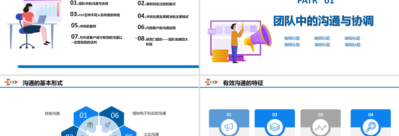 目 錄CONTENT01.團隊中的溝通與協(xié)調(diào)03.PDP五種不同人際風格的特色02.傾聽時應(yīng)注意的要點04.沖突處理及其解決的主要模式05.沖突的案例07.與外部客戶進行有效的溝通以 --------實現(xiàn)雙贏的談判06.內(nèi)部客戶的溝通應(yīng)用08.塔克門組織——團隊發(fā)展四大 階段