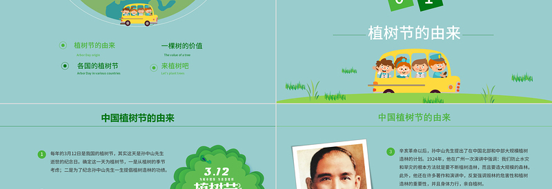 1每年的3月12日是我國的植樹節(jié),其實這天是孫中山先生逝世的紀念日。確定這一天為植樹節(jié),一是從植樹的季節(jié)考慮;二是為了紀念孫中山先生一生提倡植樹造林的功績?!?2孫中山先生從小就喜愛植樹,在他的故居至今仍生長著一棵已滿百歲的檀香山酸豆樹。這是1883年,年僅只有18歲的孫中山,千里迢迢從美國檀香山帶回幼苗親手栽種的,在他的精心培育下終于成材。