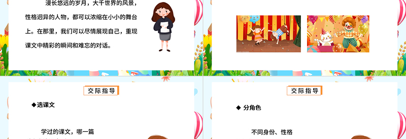 交際內(nèi)容 漫長(zhǎng)悠遠(yuǎn)的歲月,大千世界的風(fēng)景,性格迥異的人物,都可以濃縮在小小的舞臺(tái)上。在那里,我們可以盡情展現(xiàn)自己,重現(xiàn)課文中精彩的瞬間和難忘的對(duì)話。