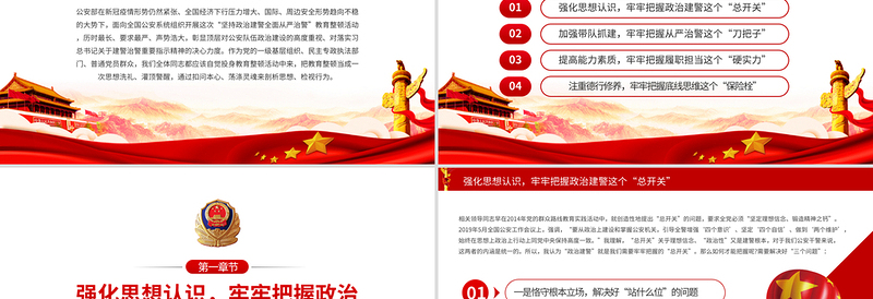 <p>政治建警 從嚴(yán)治警堅持政治建警·全面從嚴(yán)治警這里填寫您所在單位的名稱</p><br><p>序言導(dǎo)讀公安部在新冠疫情形勢仍然緊張、全國經(jīng)濟下行壓力增大、國際、周邊安全形勢趨向不穩(wěn)的大勢下,面向全國公安系統(tǒng)組織開展這次“堅持政治建警全面從嚴(yán)治警”教育整頓活動,歷時最長、要求最嚴(yán)、聲勢浩大,彰顯頂層對公安隊伍政治建設(shè)的高度重視、對落實習(xí)總書記關(guān)于建警治警重要指示精神的決心力度。作為黨的一級基層組織、民主專政執(zhí)法部門、普通黨員群眾,我們?nèi)w同志都應(yīng)該自覺投身教育整頓活動中來,把教育整頓當(dāng)成一次思想洗禮、灌頂警醒,通過扣問本心、蕩滌靈魂來剖析思想、檢視行為。</p><br><p>目錄導(dǎo)讀強化思想認(rèn)識,牢牢把握政治建警這個“總開關(guān)”01加強帶隊抓建,牢牢把握從嚴(yán)治警這個“刀把子”02提高能力素質(zhì),牢牢把握履職擔(dān)當(dāng)這個“硬實力”03注重德行修養(yǎng),牢牢把握底線思維這個“保險栓”04</p><br><p>第一章節(jié)強化思想認(rèn)識,牢牢把握政治建警這個“總開關(guān)”</p><br><p>強化思想認(rèn)識,牢牢把握政治建警這個“總開關(guān)”相關(guān)領(lǐng)導(dǎo)同志早在2014年黨的群眾路線教育實踐活動中,就創(chuàng)造性地提出“總開關(guān)”的問題,要求全黨必須“堅定理想信念、鍛造精神之鈣”。2019年5月全國公安工作會議上,強調(diào),“要從政治上建設(shè)和掌握公安機關(guān),引導(dǎo)全警增強‘四個意識’、堅定‘四個自信’、做到‘兩個維護’,始終在思想上政治上行動上同黨中央保持高度一致。”我理解,“總開關(guān)”關(guān)乎理想信念、“政治性”又是建警根本,對于我們公安干警來說,這兩者的內(nèi)涵是統(tǒng)一的。所以,我認(rèn)為“政治建警”就是我們需要牢牢把握的“總開關(guān)”。那么如何才能把握呢?需要解決好“三個問題”:一是恪守根本立場,解決好“站什么位”的問題二是履行根本職責(zé),解決好“干什么事”的問題三是落實根本要求,解決好“做什么人”的問題</p><br><p>強化思想認(rèn)識,牢牢把握政治建警這個“總開關(guān)”一是恪守根本立場,解決好“站什么位”的問題公安隊伍是人民民主專政的重要工具和紐帶,必須牢固樹立“忠誠于黨”這一根本政治立場,不斷增強“四個意識”,更加堅定“四個自信”,切實鑄造忠誠警魂。就是要堅定不移地維護黨中央權(quán)威和集中統(tǒng)一領(lǐng)導(dǎo),在思想上、政治上、行動上同以同志為核心的黨中央保持高度一致,永葆隊伍忠誠本色。對我們來講,就是要堅決貫徹落實市局黨委決策部署,堅決服從支隊黨支部的集中統(tǒng)一領(lǐng)導(dǎo)。始終站在政治高位就是要強化理論武裝,始終堅持用“中國特色社會主義”理論體系武裝頭腦,深入學(xué)習(xí)貫徹系列重要講話精神,要把學(xué)習(xí)教育第一環(huán)節(jié)做扎實、做到位,自覺做到用理想信念和黨性原則固本培元、補鈣壯骨,高揚信仰之“帆”、把穩(wěn)思想之“舵”,進一步筑牢聽黨指揮、忠誠履職的思想根基。始終站在理論高位要強化問題導(dǎo)向、目標(biāo)導(dǎo)向、工作導(dǎo)向,以自我革新的勇氣、刀刃向內(nèi)的膽氣,搞好教育整頓活動查擺剖析、整改提高環(huán)節(jié),不斷加強黨性修養(yǎng),強化黨的意識和組織意識,提高政治免疫力,始終保持清醒的政治頭腦,做政治上的“明白人”。切實做到令行禁止,不斷增強政治純潔性和鑒別力,毫不動搖地堅持黨對公安工作的絕對領(lǐng)導(dǎo),做黨和人民的忠誠衛(wèi)士。始終站在行動高位</p><br><p>強化思想認(rèn)識,牢牢把握政治建警這個“總開關(guān)”二是履行根本職責(zé),解決好“干什么事”的問題公安機關(guān)擔(dān)負(fù)著維護社會穩(wěn)定、促進社會發(fā)展、保護人民群眾生命財產(chǎn)安全的重要職責(zé)和任務(wù),必須把黨和人民的利益放在首要位置。面對社會發(fā)展進步和新形勢下公共網(wǎng)絡(luò)安全的新課題,我們必須緊緊圍繞創(chuàng)建“全國最安全地區(qū)”的總目標(biāo),把建設(shè)和維護網(wǎng)絡(luò)安全、營造清朗的網(wǎng)絡(luò)空間作為我們干事創(chuàng)業(yè)的基點,用功下力、干出成績。比如,治理XXXX問題,就是要做到7X24小時監(jiān)控嚴(yán)查、即時清理,一刻也不不能放松;圍繞網(wǎng)絡(luò)信息爆炸、輿情泛濫的問題,就是要做到“三同步”、“四個第一”,及時介入、強勢引導(dǎo)、多法并用,還百姓真相;要切實抓好“XX”、“XX”兩項工程,竭盡全力促進網(wǎng)絡(luò)社會和諧、減少網(wǎng)絡(luò)不穩(wěn)定因素,用公安隊伍的勤勞指數(shù)提高人民群眾的幸福指數(shù)。</p><br><p>強化思想認(rèn)識,牢牢把握政治建警這個“總開關(guān)”三是落實根本要求,解決好“做什么人”的問題公安干警要做到以誠信為本、以正直為貴、以寬厚為德,帶頭恪守社會公德、職業(yè)道德、家庭美德、個人品德,以德修身、以德服人,帶頭踐行社會主義核心價值觀,帶頭弘揚中華優(yōu)秀傳統(tǒng)美德,自覺遠(yuǎn)離低級趣味,堅決抵制歪風(fēng)邪氣。要模范遵守黨的紀(jì)律規(guī)矩和公安機關(guān)的鐵規(guī)禁令,杜絕執(zhí)法腐敗,杜