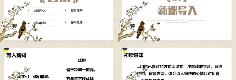 導(dǎo)入新知同學(xué)們,你們能說出一首描寫春天的古詩嗎?詠柳 碧玉妝成一樹高, 萬條垂下綠絲絳。 不知細(xì)葉誰裁出, 二月春風(fēng)似剪刀。