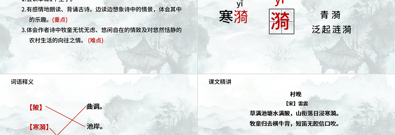 草滿池塘水滿陂 山銜落日浸寒漪 橫牛背 信口吹村 晚幽雅美麗景色美麗 悠閑自在無憂無慮課文小結