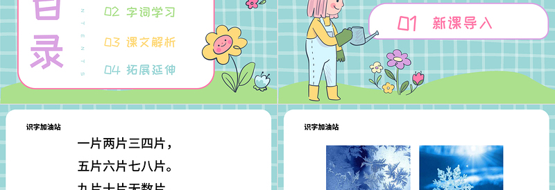 一片兩片三四片, 五片六片七八片。 九片十片無(wú)數(shù)片, 飛入水中都不見(jiàn)。同學(xué)們,知道謎底是什么嗎?識(shí)字加油站