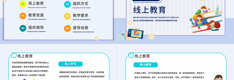 教育資源ONLINE TEACHING STANDARD TRAINING PPT TEMPLATE 通過線上教育實(shí)現(xiàn)教育目標(biāo),同時(shí)系統(tǒng)培訓(xùn)增強(qiáng)教學(xué)專業(yè)度