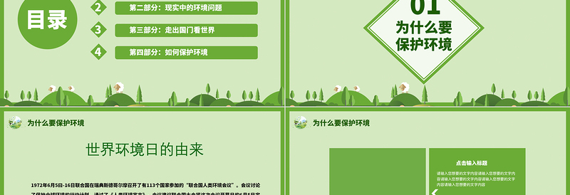 目錄 第一部分:為什么要保護(hù)環(huán)境 第四部分:如何保護(hù)環(huán)境 第三部分:走出國門看世界 第二部分:現(xiàn)實中的環(huán)境問題1234