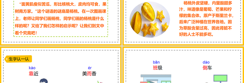 “面黃肌瘦似苦瓜,形比核桃大,皮肉均可食,果樹南方家?!边@個謎語的謎底是楊桃。在一次圖畫課上,老師讓同學們畫楊桃,同學們畫的楊桃是什么樣的呢?又給了我們怎樣的啟示呢?讓我們到文中看個究竟吧!課文導入