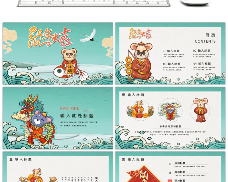 綠色中國風(fēng),鼠年大吉PPT模板,國潮,插畫風(fēng),卡通,手繪,新年,商務(wù)匯報(bào),迎戰(zhàn)鼠年,工作總結(jié) Array
