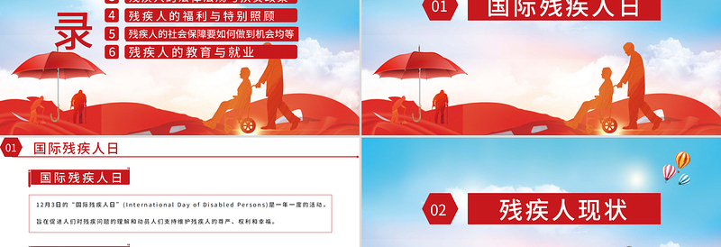 1國(guó)際殘疾人日2殘疾人現(xiàn)狀3殘疾人的法律法規(guī)與扶貧政策目錄4殘疾人的福利與特別照顧5殘疾人的社會(huì)保障要如何做到機(jī)會(huì)均等6殘疾人的教育與就業(yè)