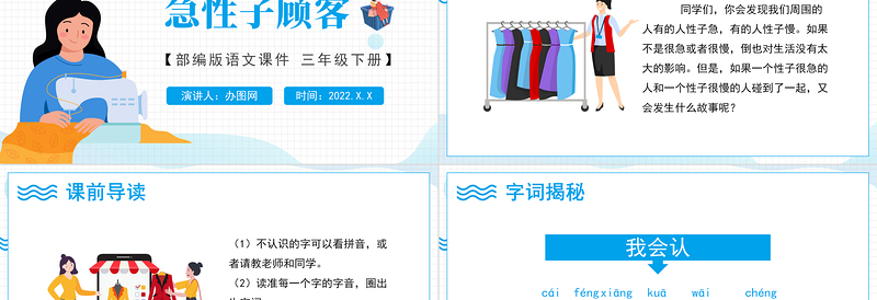 慢性子裁縫和 急性子顧客演講人:辦圖網(wǎng)時間:2022.X.X【部編版語文課件 三年級下冊】辦圖網(wǎng)www.888ppt.com