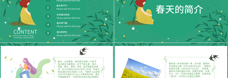1234春天的簡介Please add the title here春天的節(jié)氣Please add the title here有關(guān)春天的詩Please add the title here春天的氣候Please add the title hereCONTENTLorem ipsum dolor sit amet, consectetur adipiscing elit. 5Please add the title here春天的養(yǎng)生
