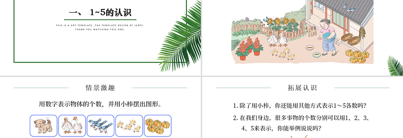 THIS IS A ART TEMPLATE ,THE TEMPLATE DESIGN BY JERRY. THANK YOU WATCHING THIS ONE. 1~5的認識和加減法第一課時:1~5的認識演講人:辦圖網(wǎng)