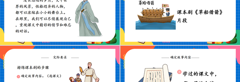 排演《草船借箭》第1、2自然段。時(shí)間:公元208年冬人物: 諸葛亮:劉備軍師 周瑜:吳國水軍大都督 地點(diǎn):東吳