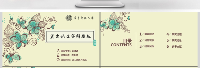 復(fù)古花紋素雅畢業(yè)論文答辯通用PPT模版 Array