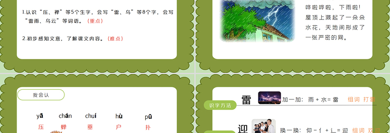 1.認(rèn)識“壓、禪”等5個(gè)生字,會寫“雷、烏”等8個(gè)字,會寫“雷雨、烏云”等詞語。 (重點(diǎn)) 2.初步感知文意,了解課文內(nèi)容。(難點(diǎn))學(xué)習(xí)目標(biāo)