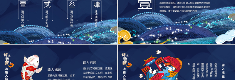 藍(lán)色,國(guó)潮,好運(yùn),錦鯉,中國(guó)風(fēng),中式,手繪,插畫(huà)風(fēng),活動(dòng)策劃,活動(dòng)計(jì)劃,商業(yè)策劃書(shū),匯報(bào),宣傳,PPT,模板 Array