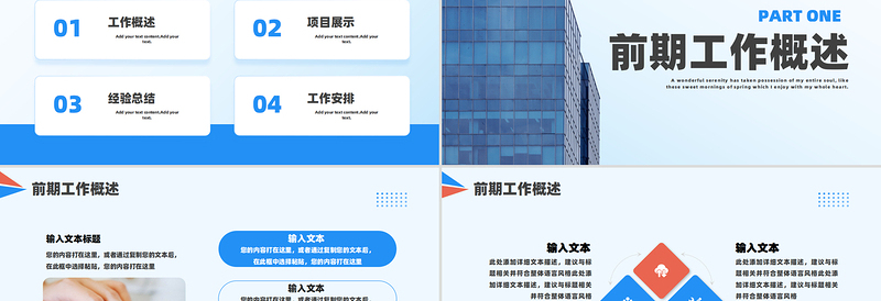 CONTENTS目錄01工作概述Add your text content.Add your text.02項目展示Add your text content.Add your text.03經(jīng)驗總結(jié)Add your text content.Add your text.04工作安排Add your text content.Add your text.