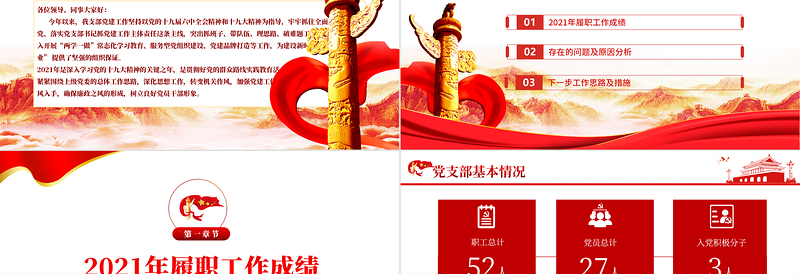 各位領(lǐng)導(dǎo)、同事大家好: 今年以來(lái),我支部黨建工作堅(jiān)持以黨的十九屆六中全會(huì)精神和十九大精神為指導(dǎo),牢牢抓住全面從嚴(yán)治黨、落實(shí)黨支部書(shū)記抓黨建工作主體責(zé)任這條主線,突出抓班子、帶隊(duì)伍、理思路、破難題工作思路,深入開(kāi)展“兩學(xué)一做”常態(tài)化學(xué)習(xí)教育、服務(wù)型黨組織建設(shè)、黨建品牌打造等工作,為建設(shè)新時(shí)代“偉大事業(yè)” 提供了堅(jiān)強(qiáng)的組織保證。2021年是深入學(xué)習(xí)黨的十九大精神的關(guān)鍵之年,是貫徹好黨的群眾路線實(shí)踐教育活動(dòng)的重要一年,黨支部緊緊圍繞上級(jí)黨委的總體工作思路,深化思想工作,轉(zhuǎn)變機(jī)關(guān)作風(fēng),加強(qiáng)黨建工作,從反“四風(fēng)”,轉(zhuǎn)作風(fēng)入手,確保廉政之風(fēng)的形成,樹(shù)立良好黨員干部形象。前言PREFACE