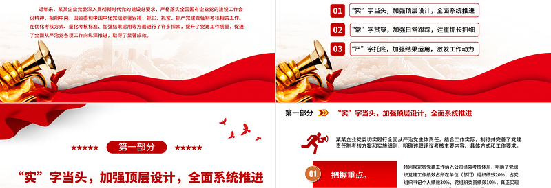 近年來,某某企業(yè)黨委深入貫徹新時代黨的建設(shè)總要求,嚴(yán)格落實(shí)全國國有企業(yè)黨的建設(shè)工作會議精神,按照中央、國資委和中國中化黨組部署安排,抓實(shí)、抓常、抓嚴(yán)黨建責(zé)任制考核相關(guān)工作。在優(yōu)化考核方式、量化考核標(biāo)準(zhǔn)、加強(qiáng)結(jié)果運(yùn)用等方面進(jìn)行了許多探索,提升了黨建工作質(zhì)量,促進(jìn)了全面從嚴(yán)治黨各項(xiàng)工作向縱深推進(jìn),取得了顯著成效。前言PERFACE