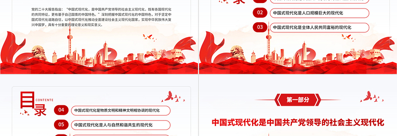 目錄CONTENTE中國式現(xiàn)代化是中國共產黨領導的社會主義現(xiàn)代化01中國式現(xiàn)代化是人口規(guī)模巨大的現(xiàn)代化02中國式現(xiàn)代化是全體人民共同富裕的現(xiàn)代化03
