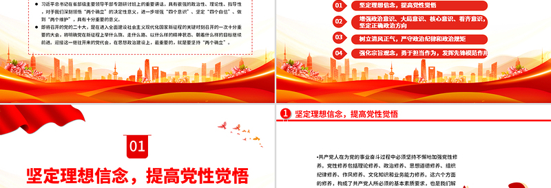 1堅(jiān)定理想信念,提高黨性覺悟崇高的理想信念,是共產(chǎn)黨人堅(jiān)實(shí)的思想基礎(chǔ),是推動(dòng)黨的事業(yè)前進(jìn)的強(qiáng)大精神力量。在黨性修養(yǎng)中,我們要深刻認(rèn)識(shí)理想信念的引導(dǎo)作用﹐樹立共產(chǎn)主義的遠(yuǎn)大理想和中國(guó)特色社會(huì)主義信念。 理想信念對(duì)黨性修養(yǎng)起著引領(lǐng)作用。我們共產(chǎn)黨人參加工作是為了什么、入黨是為了什么、今后要留下什么,這都要靠理想信念來(lái)決定。理想信念正確了才說得上有正確的世界觀、人生觀、價(jià)值觀,才說得上有正確的政績(jī)觀、權(quán)力觀、利益觀。 具有堅(jiān)定正確的理想信念,這是我們共產(chǎn)黨人的真正優(yōu)勢(shì)。理想的滑坡,是最致命的滑坡;信念的動(dòng)搖,是最危險(xiǎn)的動(dòng)搖。很多人正是因?yàn)槔硐胄拍顒?dòng)搖了,才導(dǎo)致革命意志衰退,個(gè)人至上、追名逐利,政治鑒別力和政治敏銳性急劇減弱,以至于淪為錯(cuò)誤思潮的俘虜,淪為腐化變質(zhì)分子。