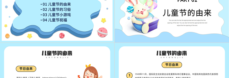 PART 01兒童節(jié)的由來You can also format the appropriate text and adjust the line spacing of the text. You can also format the appropriate text and adjust the line spacing of the text.