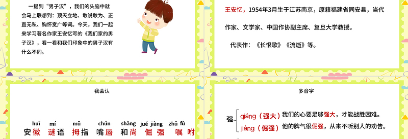 一提到“男子漢”,我們的頭腦中就會(huì)馬上聯(lián)想到:頂天立地、敢說(shuō)敢為、正直無(wú)私、胸懷寬廣等詞。今天,我們一起來(lái)學(xué)習(xí)著名作家王安憶寫的《我們家的男子漢》,看一看和我們印象中的男子漢有什么不同。課前導(dǎo)讀