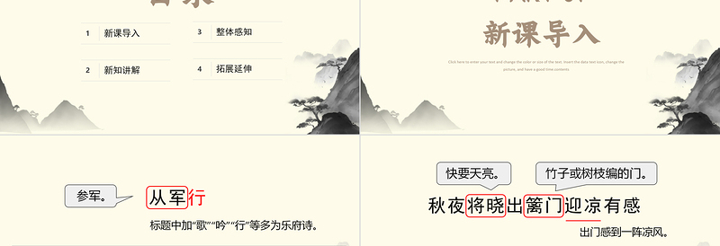 人教部編版五年級(jí)下冊(cè)語文PPT課件《從軍行》匯報(bào)人:辦圖網(wǎng) 時(shí)間:2022.XXClick here to enter your text and change the color or size of the text. Insert the data text icon, change the picture, and have a good time.contents