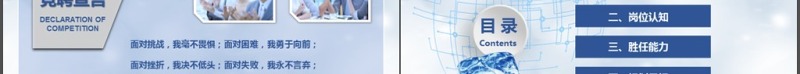 競聘宣言DECLARATION OF COMPETITION面對挑戰(zhàn),我毫不畏懼;面對困難,我勇于向前;面對挫折,我決不低頭;面對失敗,我永不言棄;面對自己,我不斷超越。我們頑強(qiáng)拼搏,共同進(jìn)步,我努力!我堅(jiān)持!我奮斗!我拼搏!我一定能行!