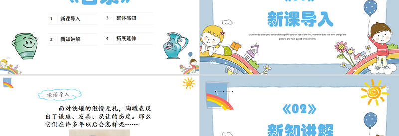 《陶罐和鐵罐》Click here to enter your text and change the color or size of the text. Insert the data text icon, change the picture, and have a good time.contents人教部編版三年級下冊語文PPT模板匯報人:辦圖網 時間:2022
