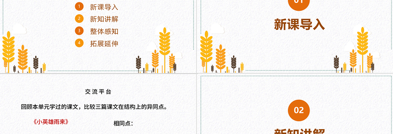 回顧本單元學(xué)過(guò)的課文,比較三篇課文在結(jié)構(gòu)上的異同點(diǎn)。《小英雄雨來(lái)》《我們家的男子漢》《蘆花鞋》相同點(diǎn):篇幅長(zhǎng)分部分交流平臺(tái)