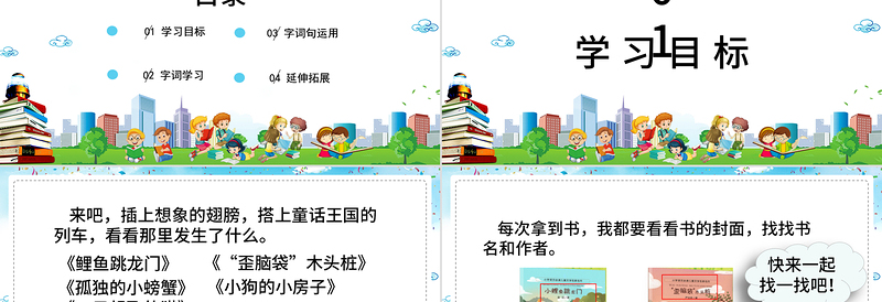 來吧,插上想象的翅膀,搭上童話王國的列車,看看那里發(fā)生了什么?!丁巴崮X袋”木頭樁》《鯉魚跳龍門》《小狗的小房子》《孤獨的小螃蟹》《一只想飛的貓》 看到這些書名,你想知道故事中的主人公有怎樣的奇遇嗎?先猜猜看,再打開童話故事書,我們一起來讀一讀。