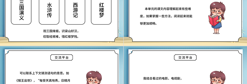 本單元的課文內(nèi)容理解起來有些難度,如果掌握一些方法,閱讀起來就能夠更加順暢。讀完上面四個(gè)小朋友說的話,結(jié)合本單元的學(xué)習(xí),看看你都了解了哪些理解課文內(nèi)容的方法?交流平臺(tái)
