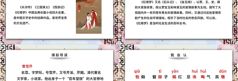 《紅樓夢》又名《石頭記》、《金玉緣》,以賈、王、史、薛四大家族背景,既以賈寶玉和林黛玉的愛情故事為主線,描寫了大觀園內(nèi)外一系列青年男女的愛情故事。同時,又通過對這些愛情悲劇產(chǎn)生的社會環(huán)境描繪,昭示了當(dāng)時社會的世態(tài)風(fēng)貌??梢哉f,《紅樓夢》是當(dāng)時社會生活的百科全書?!≌n前導(dǎo)讀