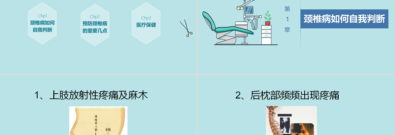 目錄 CONTENTSChp1 頸椎病如何自我判斷Chp2 預(yù)防頸椎病的重要幾點Chp3 醫(yī)療保健