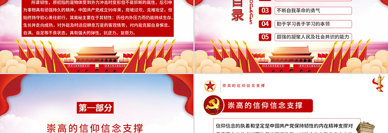 目錄contents01崇高的信仰信念支撐 02一以貫之的憂患意識03不斷自我革命的勇氣 04勤于學(xué)習(xí)善于學(xué)習(xí)的本領(lǐng) 05超強(qiáng)的凝聚人民及社會共識的能力